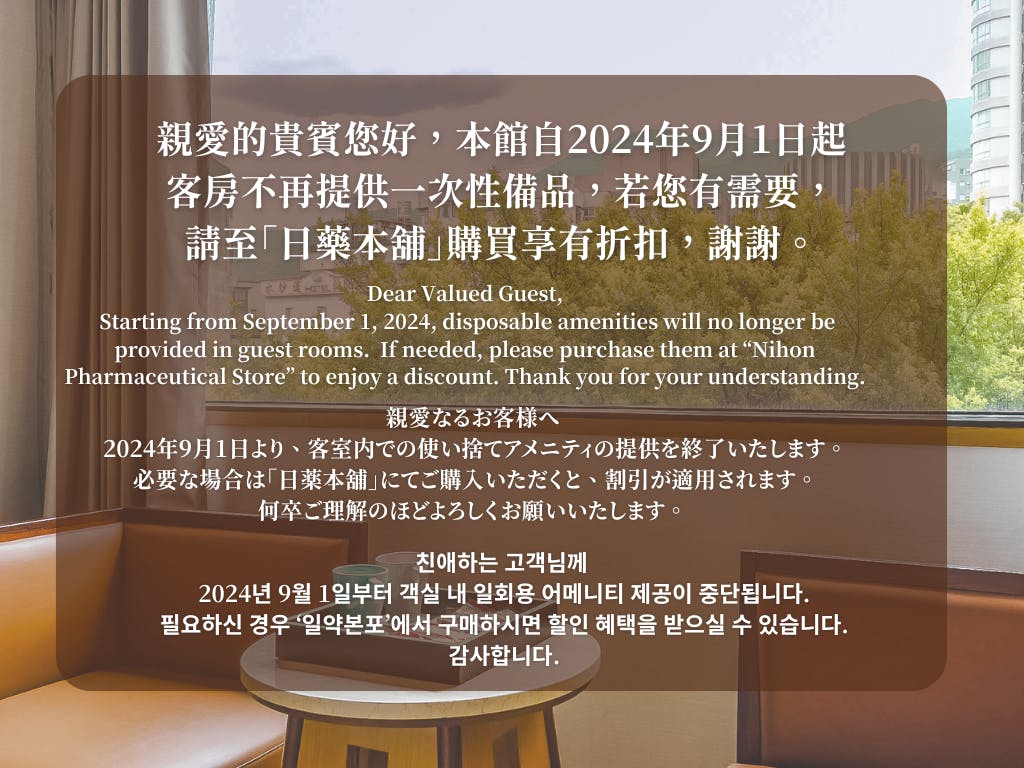 Starting from September 1, 2024, disposable amenities will no longer be provided in guest rooms. If needed, please purchase them at “Nihon Pharmaceutical Store” to enjoy a discount. Thank you for your understanding.