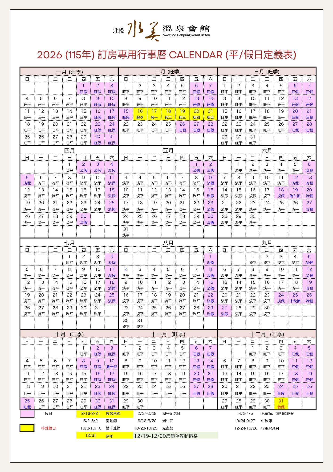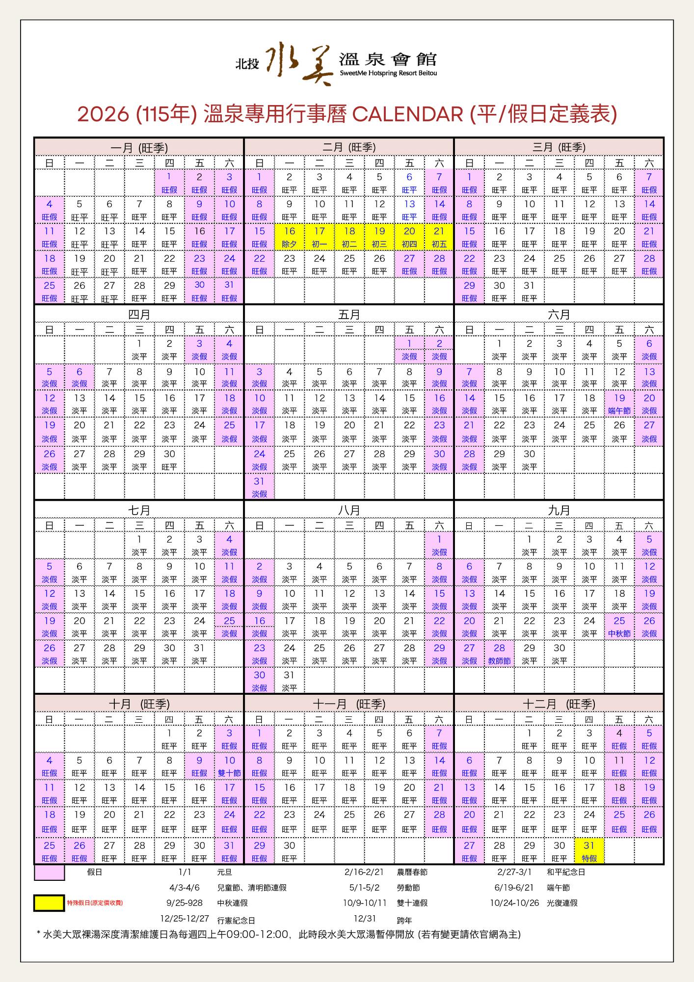- 1/1、2/27-3/1、4/3-4/6、5/1-5/2、6/19-6/21、9/25-9/28、10/9-10/11、10/24-10/26、12/25-12/27